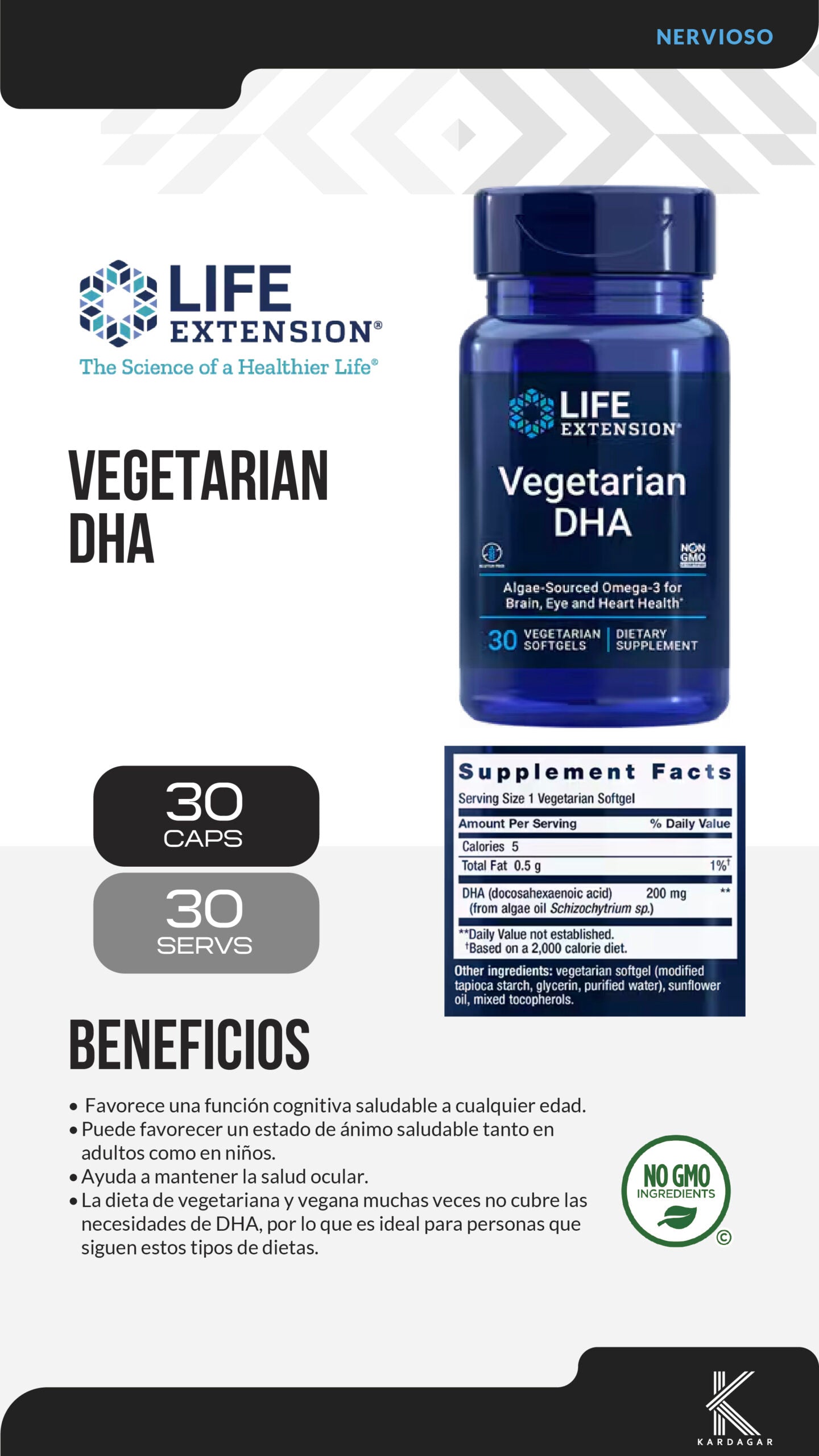 🌱 ESPECIFICACIÓN VEGANA: Cubre las necesidades de DHA en dietas que no incluyen pescado mediante algas de origen sustentable.